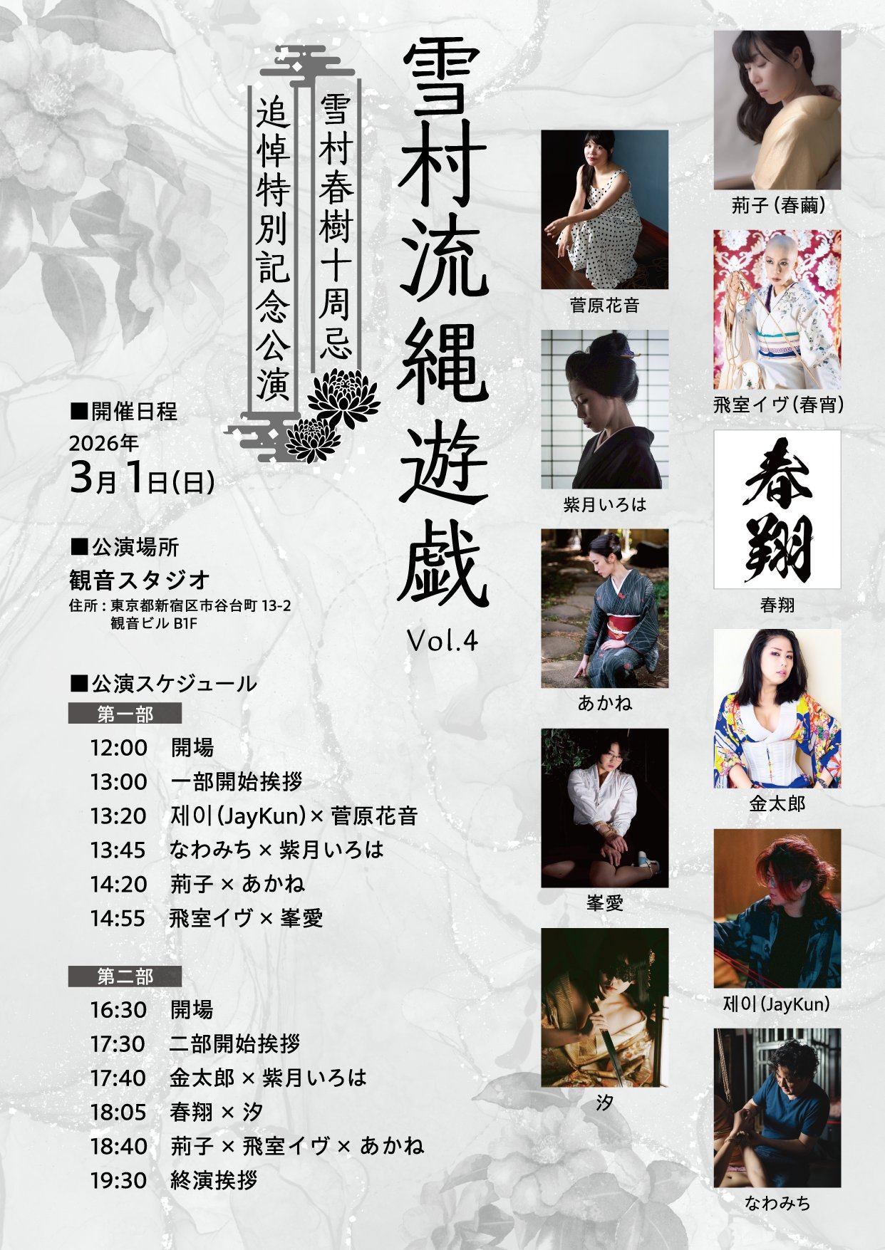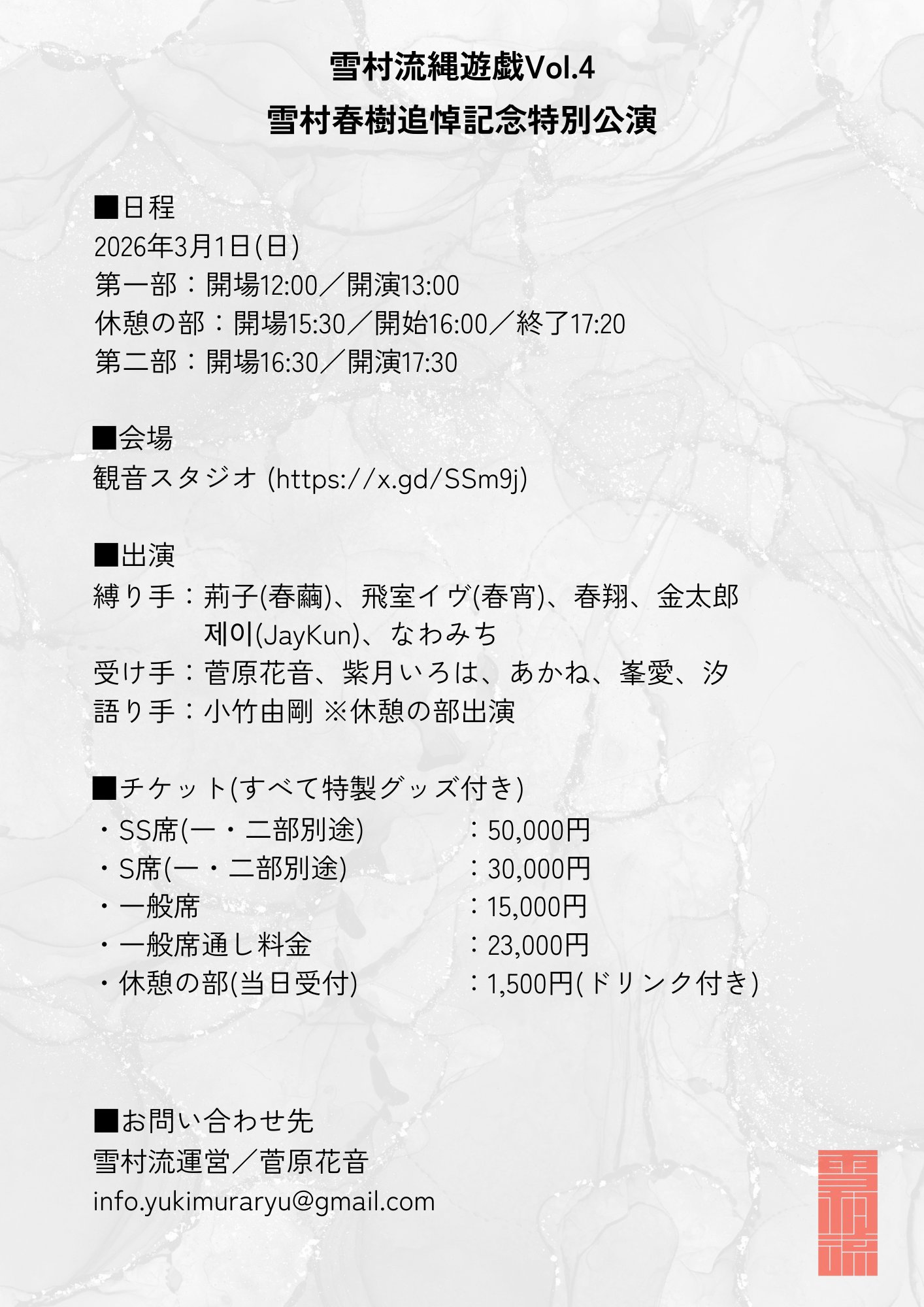 Rope artists who inherited Yukimura-ryu, from Japan and overseas, will gather on one stage to express its living legacy.