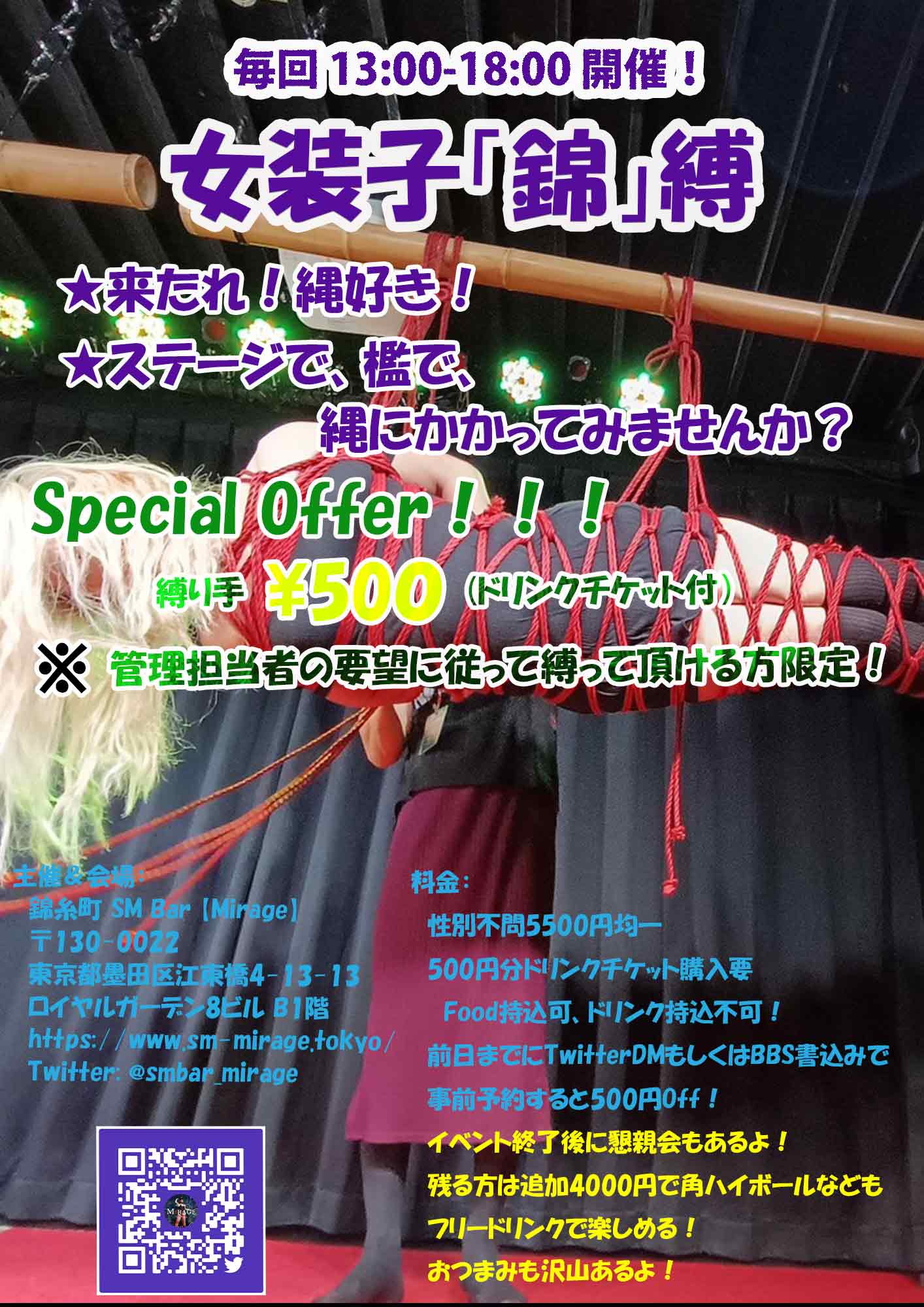女装子さんを縛ってみたい方、女装子さんで縛られたい方、広いMirageの空間を十二分に活用してくださいね。